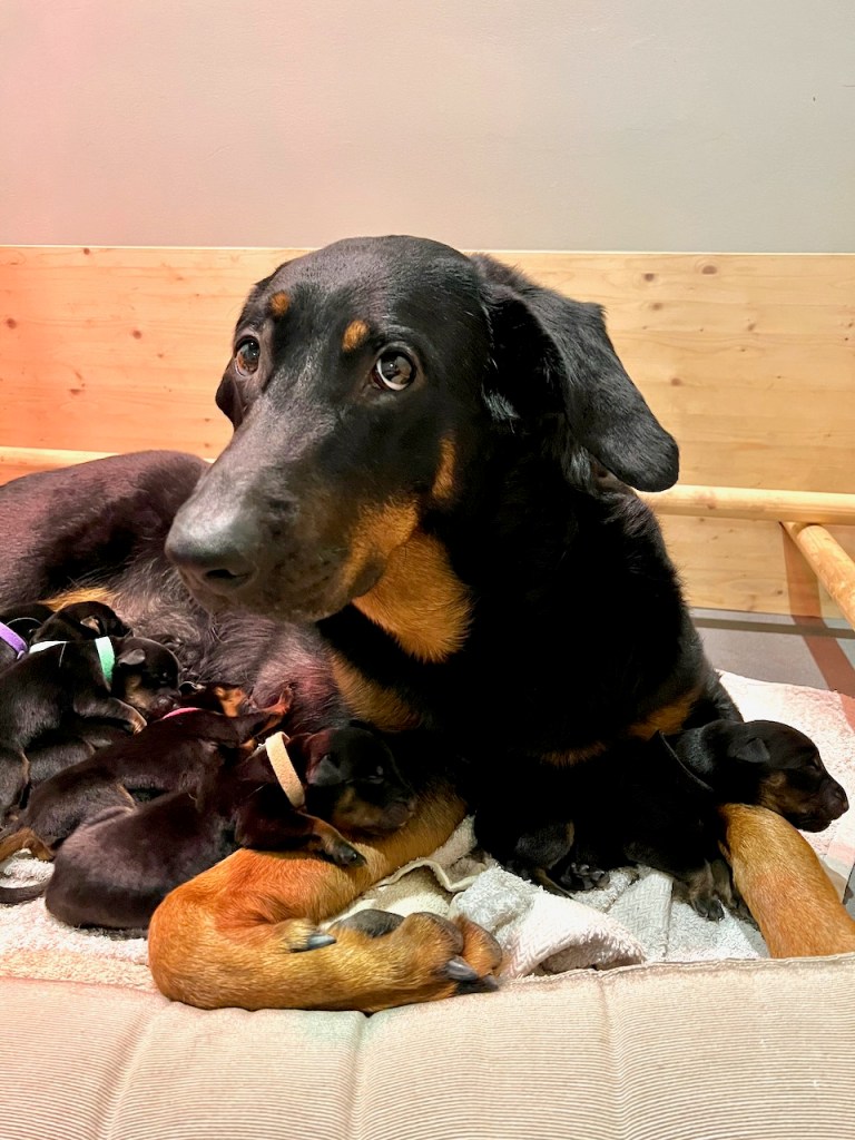 Olemme päivystäneet ensimmäisen viikon pentulaatikon äärellä vuorotellen 24/7, ja Rofa myös nukkuu patjalla laatikon vieressä. Haluamme varmistua että alku menee hyvin, eikä havereita satu. Navi on alku-ihmetyksen jälkeen rentoutunut ja hoitanut pentunsa hienosti ja yllättävänkin rauhallisesti. Se jaksaa olla aloillaan pentulaatikossa pitkiäkin aikoja. Äitinsä Nelly oli selvästi hätäisempi emo, joka tykkäsi että kun lapset on syöneet hän voikin lähteä muualle touhuamaan.